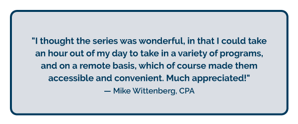 By purchasing the CORE CPE Series Bundle, you are registering for each CORE CPE Series webinar included in that bundle. Due to the unbeatable value of the CORE CPE Series, we are unable to apply additional discounts to the purchase price, nor can we offer substitutions, transfers, or refunds of any kind. Additionally, unattended webinars do not “roll over” into any subsequent year’s CORE CPE Series.