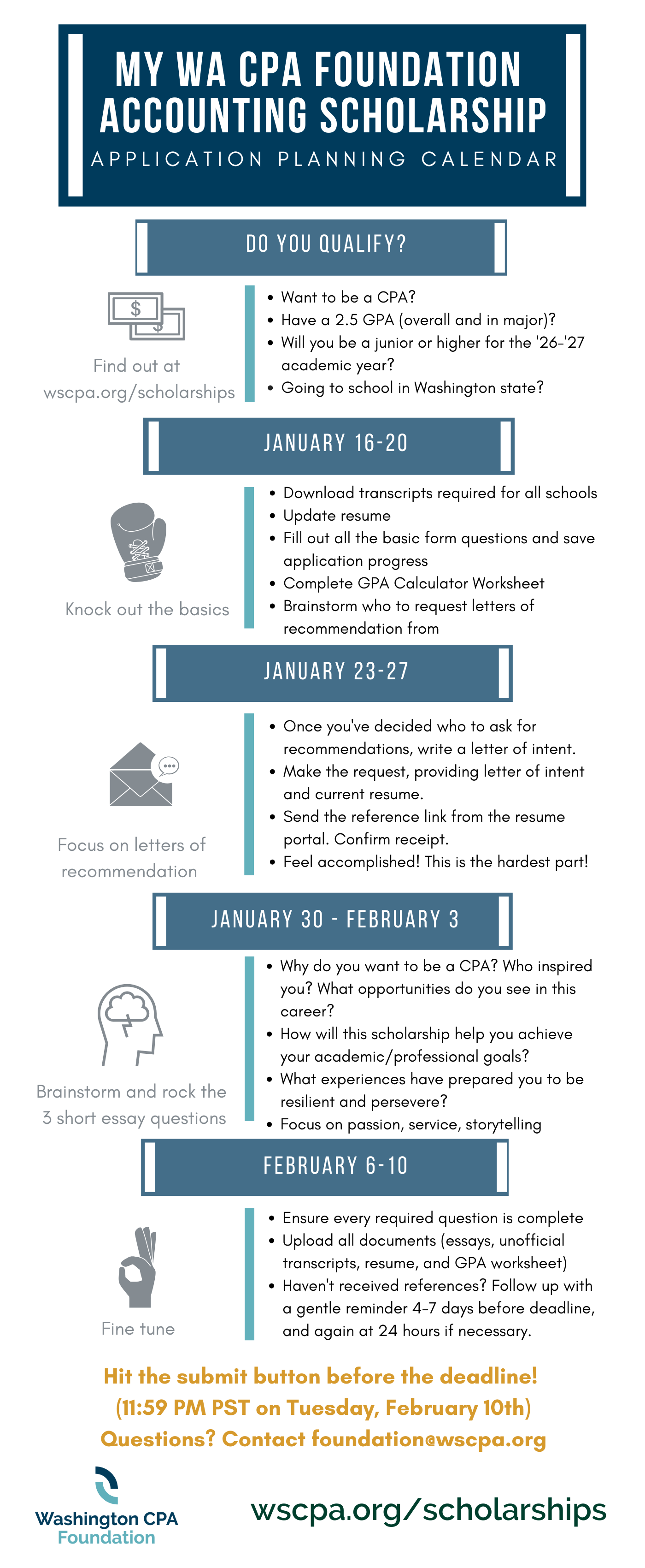 The deadline for Washington CPA Foundation Accounting Scholarship applications is less than a month away. You have until 11:59 PM PST on Tuesday, February 10, to finish and submit your application. Last year, about one-third of applicants walked away with a scholarship to fund their education, as well as validation and support from members of the CPA community who believed in their success. Check out this handy infographic (click on the image for a full screen view) for help breaking down the application process into a few manageable, weekly steps over the next month.